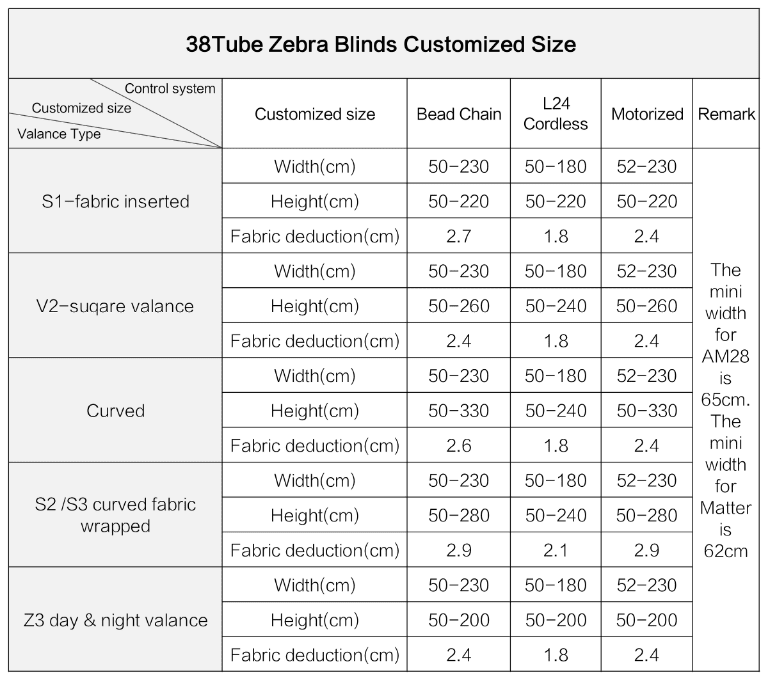 Explore the precise parameters of our valance and tube options, meticulously designed to ensure a perfect fit and optimal performance for your zebra blinds. These detailed specifications, including dimensions and configurations, cater to a wide range of installation preferences
